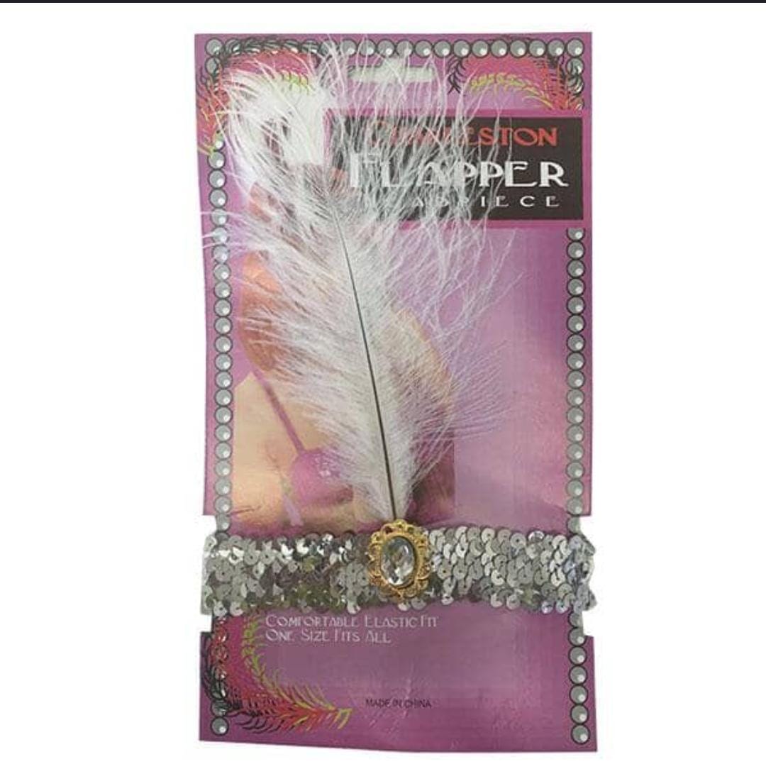 1920s-inspired white feather headband with a shimmering silver band, accented by a silver gem framed in gold for a glamorous vintage look.