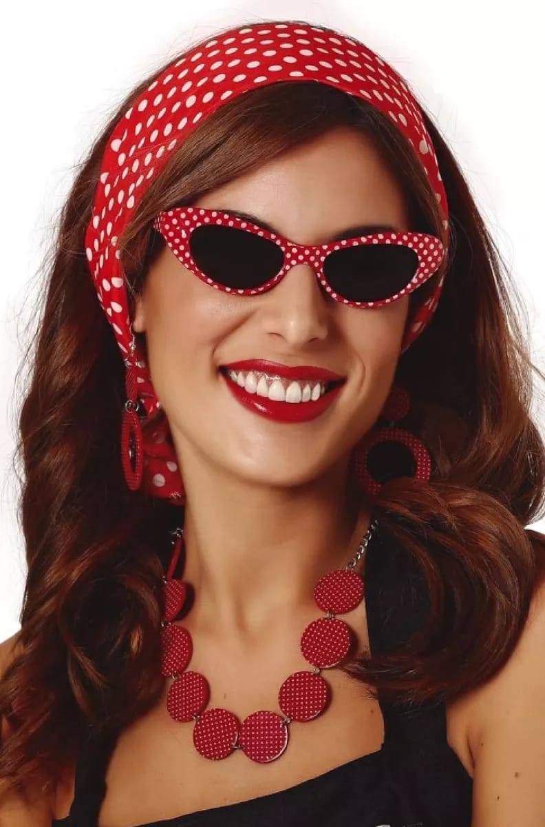 Step back into classic retro charm with this iconic 50s accessory set, complete with bold red glasses, a matching scarf, and coordinating earrings and necklace. The vibrant red cat-eye glasses capture the playful spirit of the decade, adding instant personality and flair. A chic red scarf ties the look together—perfect for styling around the neck, hair, or handbag for an authentic vintage touch.
