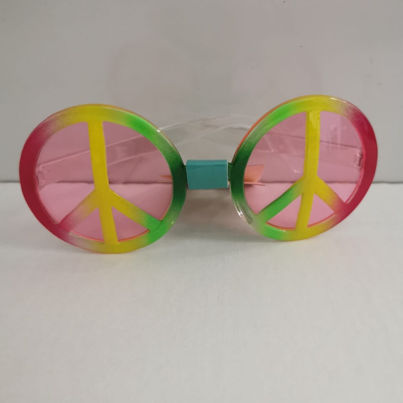 Multicolor Rainbow Peace Sign Glasses. Celebrate 60s and 70s style with these vibrant peace sign glasses featuring a mix of red,yellow and green . A fun and goofy accessory for any retro look!