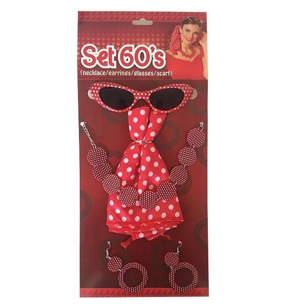 A retro 60s-inspired set featuring red polka dot sunglasses, a sound necklace, matching earrings, and a coordinating scarf, perfect for a playful and vintage look.