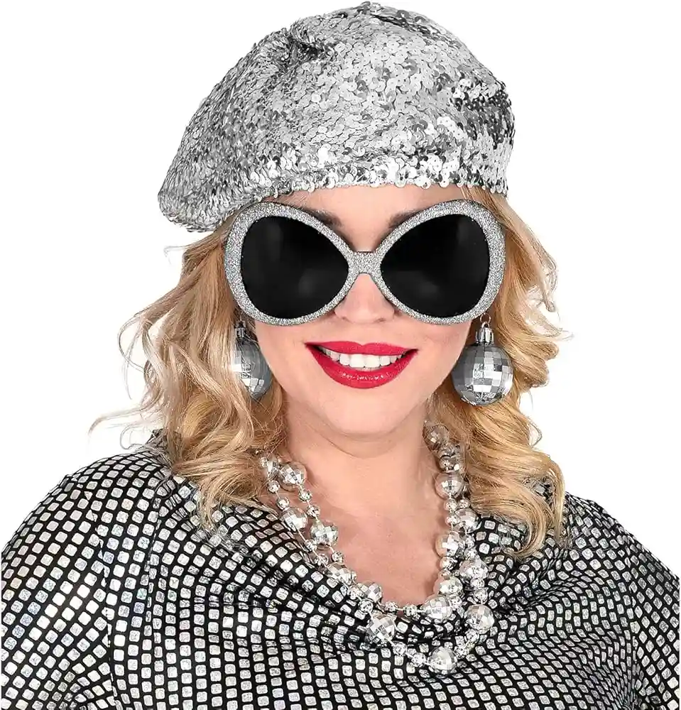 Get groovy with this sparkling set featuring silver disco ball earrings, a silver sequin barrette, and silver glitter glasses with black lenses. Perfect for any retro party!