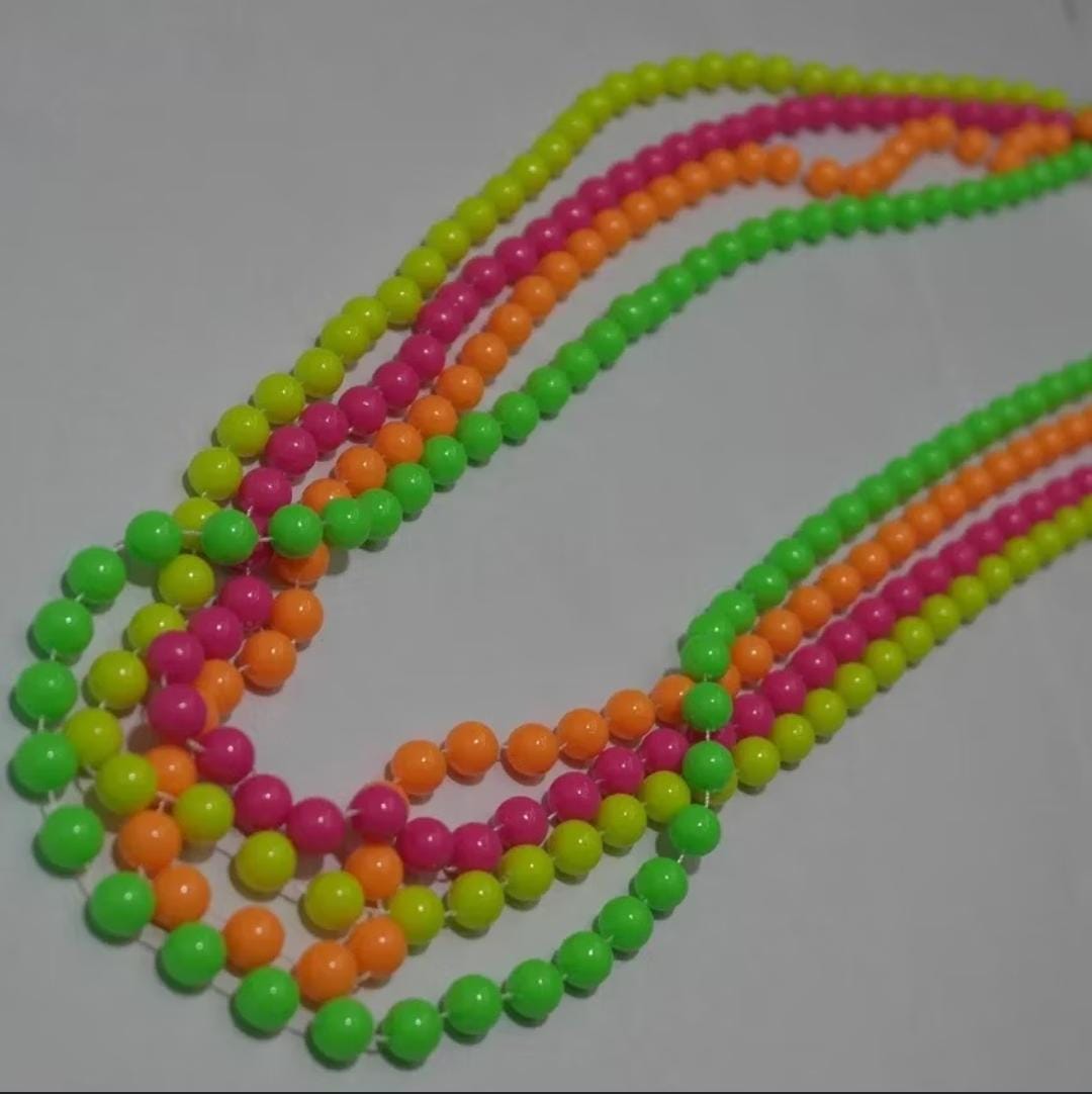 Vibrant 80s-inspired bead mix in green, orange, pink, and yellow, perfect for retro jewelry and DIY crafts.