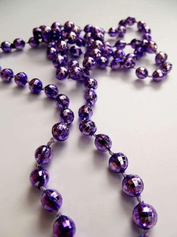 Vibrant Mardi Gras purple beads with a metallic finish, perfect for parades, parties, and festive celebrations. Lightweight and eye-catching!