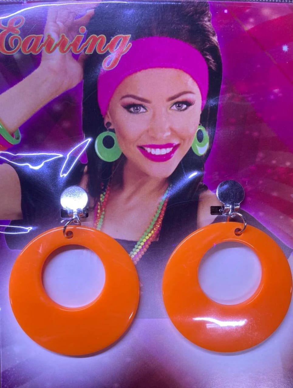 These 80s-inspired orange clip-on hoop earrings add a BALD pop of color and retro flair to any outfit, offering a comfortable fit for those without pierced ears.