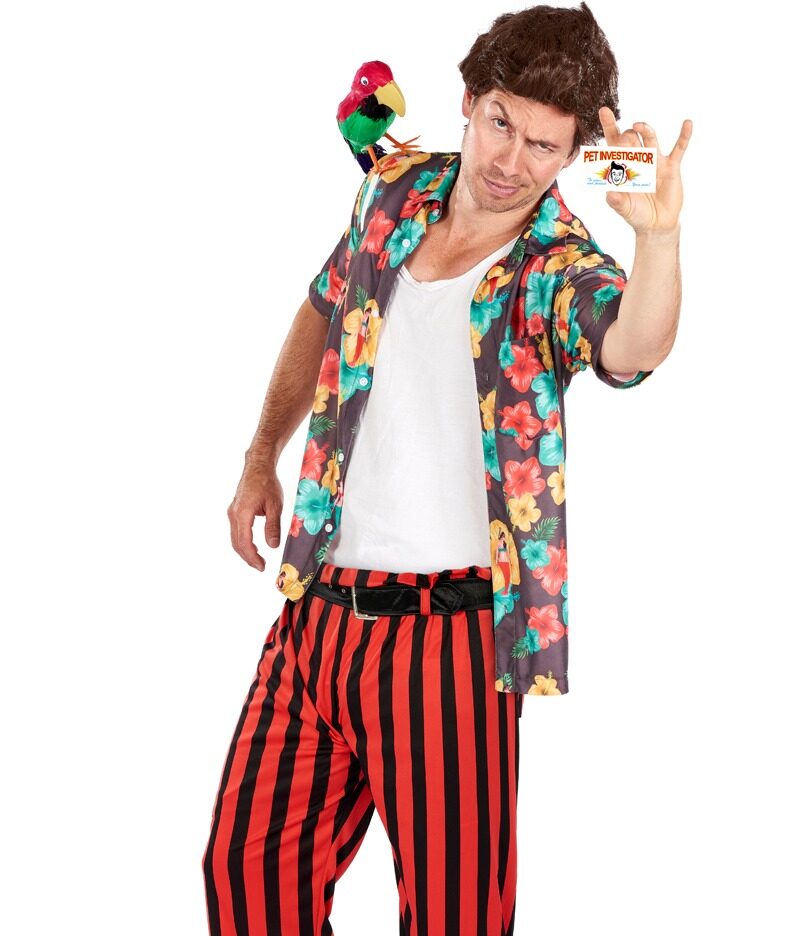 Step into the wild world of comedy with this Ace Ventura costume! Featuring his signature loud, patterned Hawaiian shirt, striped pants, and quirky hairstyle, this outfit perfectly captures the eccentric, over-the-top personality of Jim Carrey’s iconic pet detective. Accessories like the belt and sunglasses complete the instantly recognizable look.