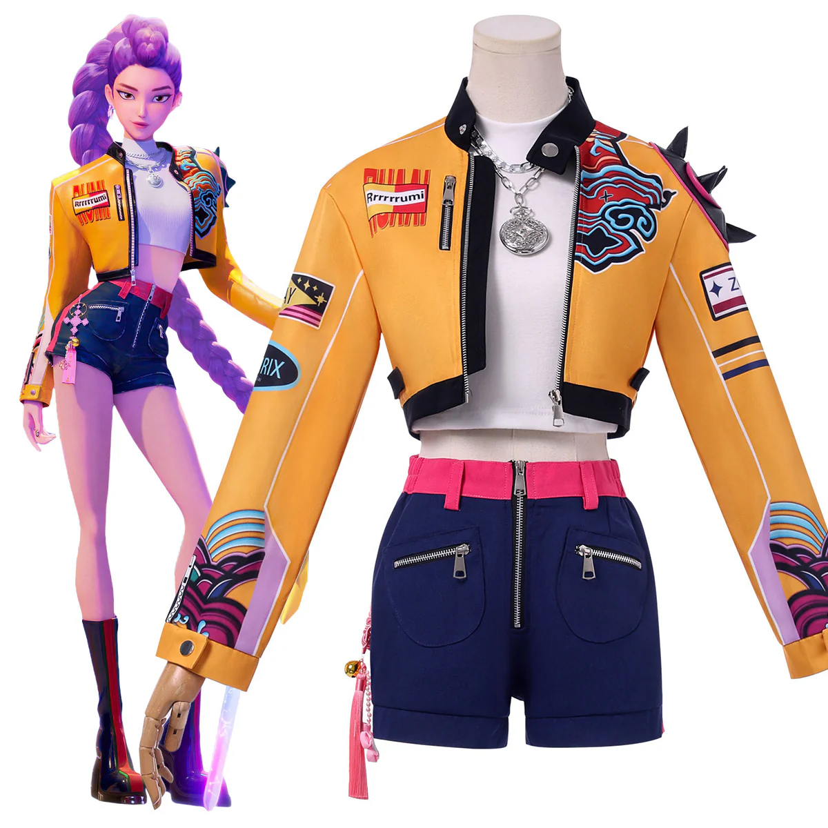 Bring the heat with Rumi’s bold and unforgettable look from K-Pop Demon Hunters! This standout costume features her iconic cropped yellow jacket—bright, eye-catching, and loaded with attitude. The jacket includes utility-inspired details like zipper accents, reinforced shoulders, and graphic patches that highlight her dual role as a K-pop idol and demon-slaying powerhouse.