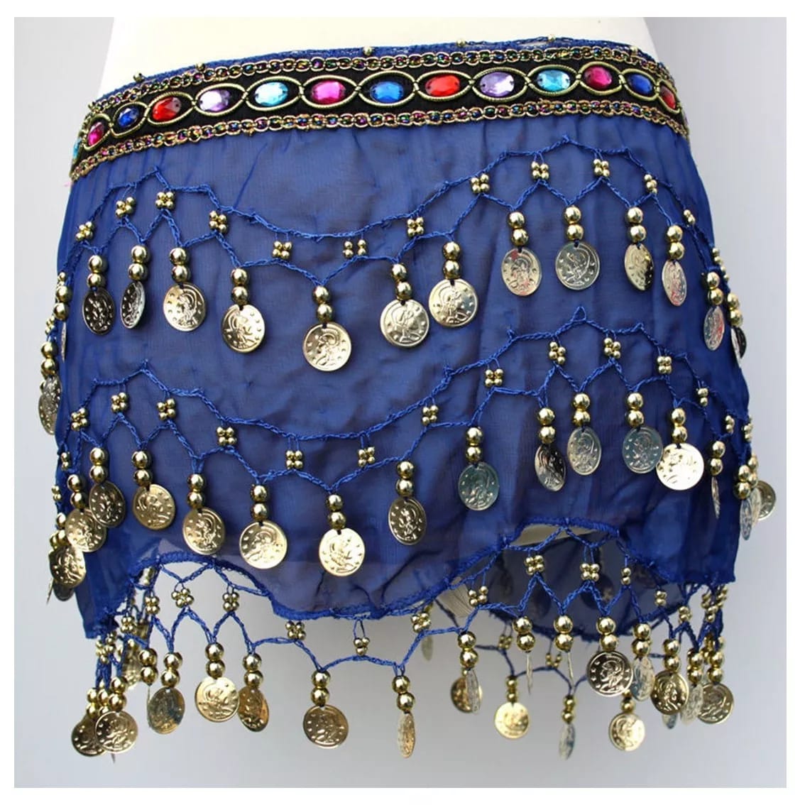 This stunning blue belly dancing skirt brings a cool, elegant flair to your dance. The flowing fabric creates a graceful silhouette, moving beautifully with every step. The vibrant multi-colored band at the waist adds a striking contrast, infusing the skirt with playful energy. Ideal for performances, rehearsals, for casual dance sessions, this skirt combines sophistication with fun. The lightweight material ensures comfort and freedom of movement, making it a versatile and eye-catching piece for any belly dancer.