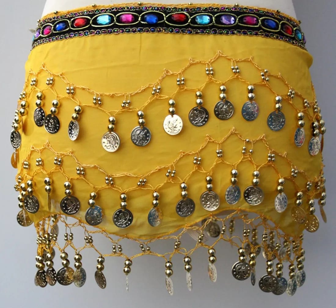 This radiant yellow belly dancing skirt brings a vibrant burst of color to your dance ensemble. The flowing fabric creates a beautiful, dynamic silhouette that moves with grace and ease. The multi-colored band at the waist adds a striking contrast, infusing the skirt with energy and playfulness. Perfect for performances, rehearsals, for casual dance sessions, this skirt combines boldness with elegance. The lightweight material ensures comfort and freedom of movement, making it a lovely and versatile addition to your belly dancing wardrobe.