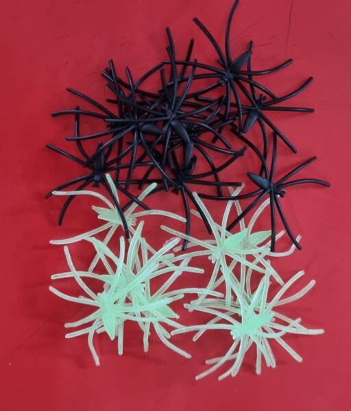 A packet of spiders featuring a mix of black and green spiders, perfect for Halloween for themed decorations. These creepy crawlers add a spooky touch to any setting, whether scattered across a table, hung from the ceiling, for used as part of a larger display.