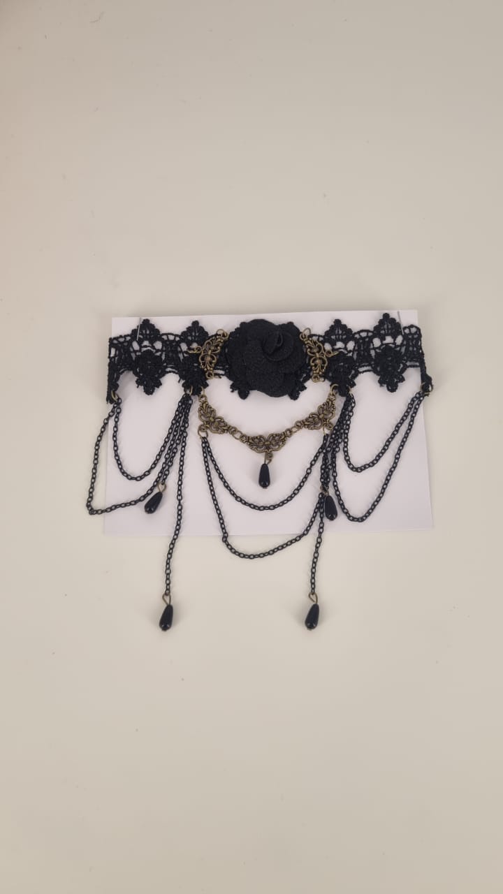 Black Lace Choker with Black Rose and Chains – Elegant and gothic, this black lace choker features a delicate black rose at the center, accented with cascading chains for a dramatic steampunk or Victorian touch.