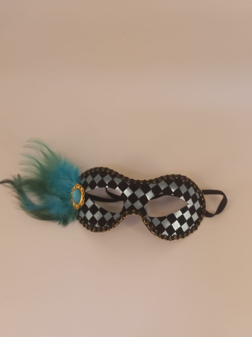 A black mask with light blue dots and feathers combines elegance with a playful twist. The black base offers a classic, sophisticated feel, while the light blue dots and delicate feathers add a touch of whimsy and flair.