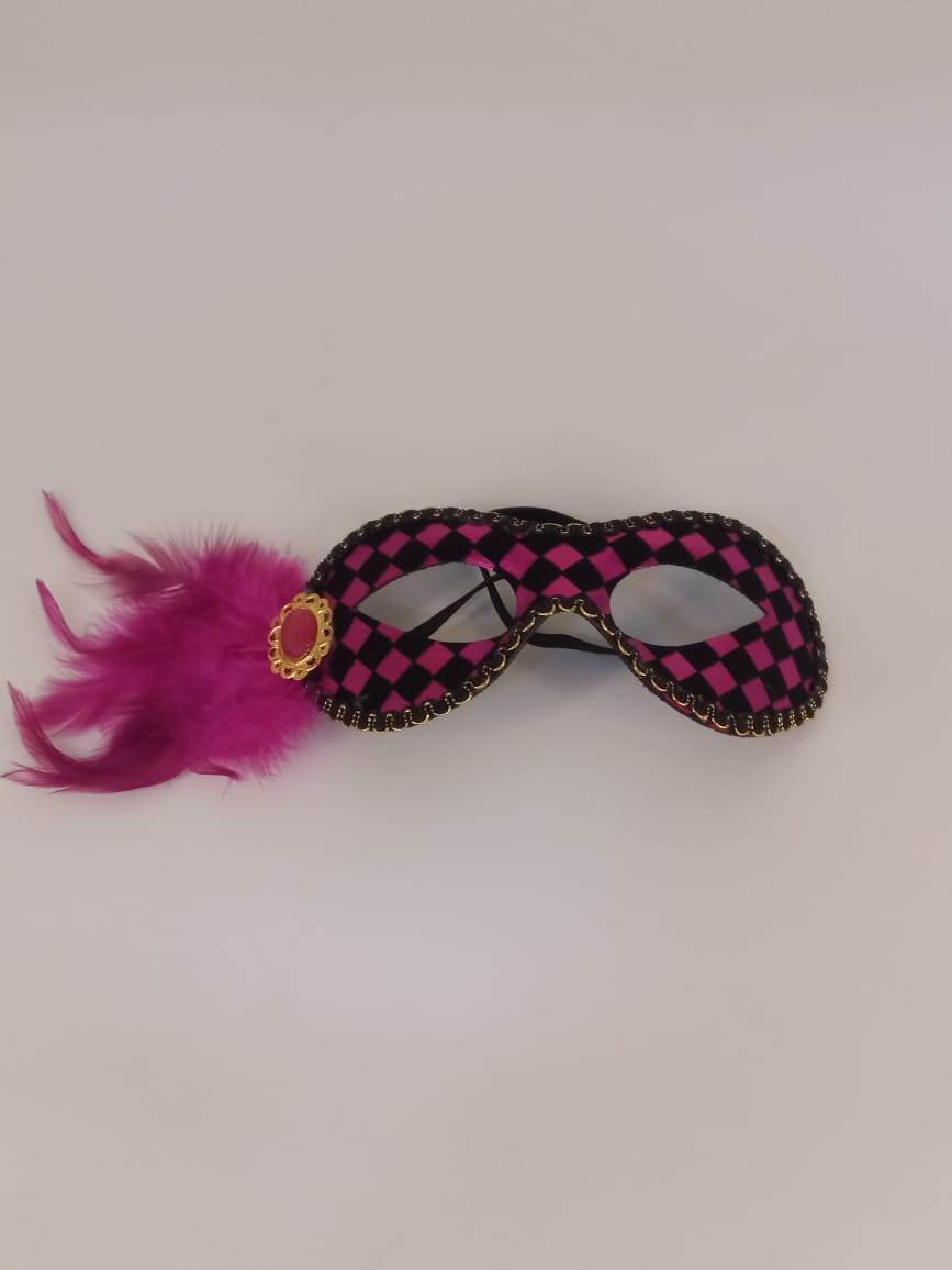 A black mask with pink dots and feathers is a bold, stylish accessory. The contrast of the dark black base with playful pink dots, paired with delicate feathers, creates a chic and dramatic look.
