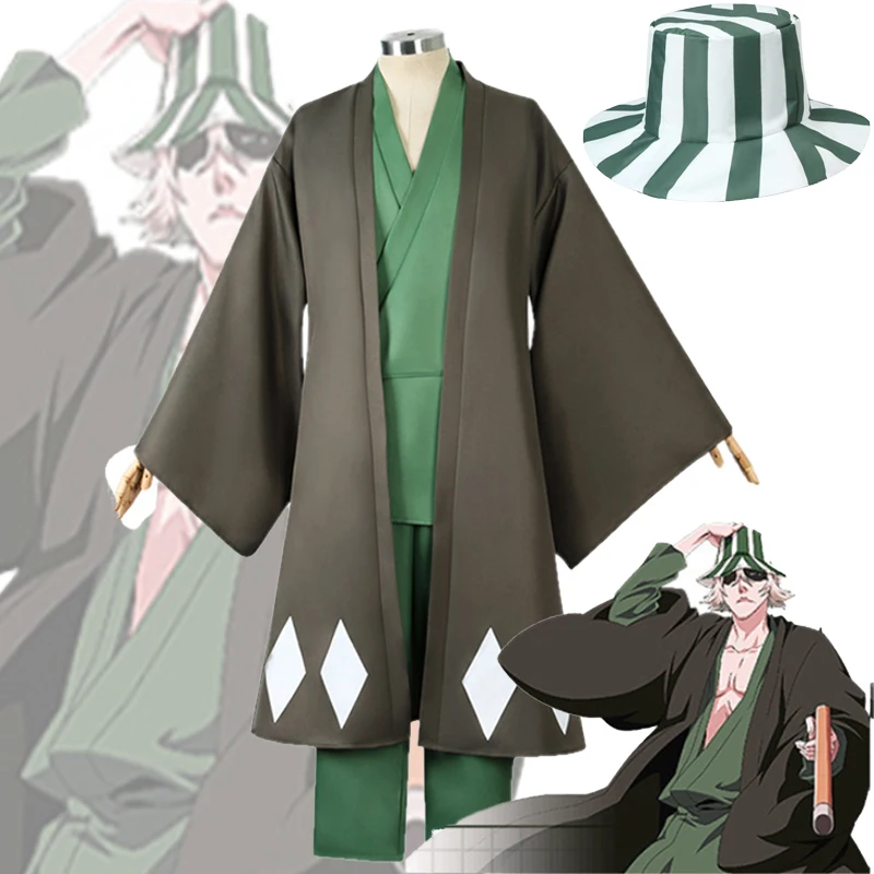 Step into the mysterious and stylish world of Bleach with this authentic Urahara Kisuke Costume! Designed to replicate the signature look of the iconic former Soul Reaper Captain, this outfit features his classic green and white striped bucket hat, dark green haori-style coat, and relaxed yet powerful style that fans instantly recognize.