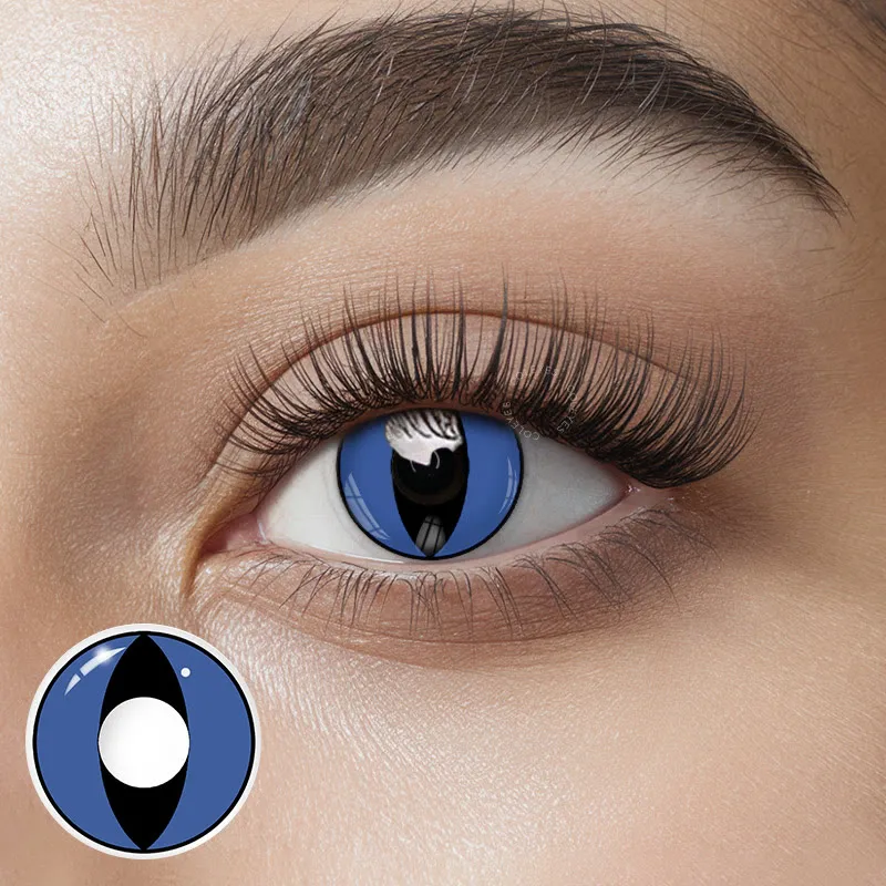 Enhance your look with Cat Eye Blue Contact Lenses. These lenses feature a striking blue color combined with a captivating cat-eye design, giving your eyes an intense, fierce appearance. Perfect for costume parties, cosplay, for adding a dramatic effect to theatrical performances, these lenses offer both comfort and a stunning visual transformation. mesmerizing blue cat-eye style. Ideal for anyone looking to stand out with a unique and unforgettable look!