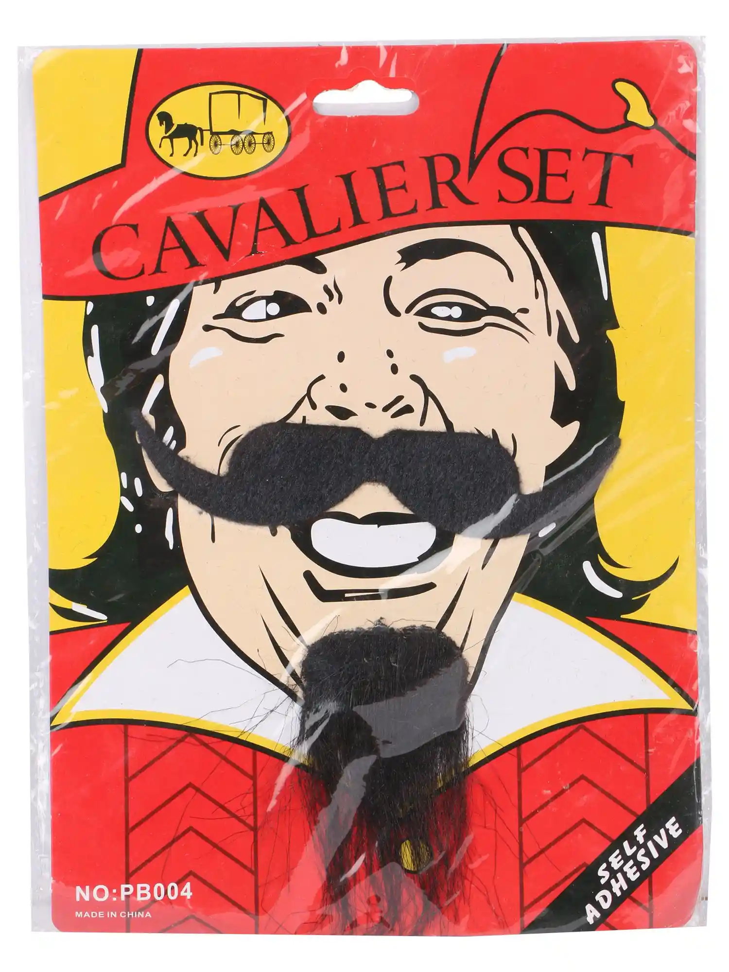 A Black Cavalier Set with eyebrows, mustache, and a small beard creates a refined and dramatic look inspired by 17th-century nobility. Black Eyebrows: Bold black eyebrows to compliment the look and enhance facial features, often achieved with makeup for adhesive fake eyebrows.