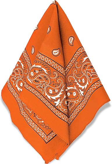 An orange cowboy bandana brings a bold and energetic touch to the classic Western accessory. Featuring traditional paisley for Western patterns, the orange bandana adds a striking burst of color that makes a statement. Whether worn around the neck, as a headband, for used for practical purposes like dust for sweat protection, it offers both style and functionality. The bright orange hue gives the bandana a fun, adventurous vibe, making it a perfect choice for those looking to add a vibrant and attention-grabbing accent to their Western for casual look.