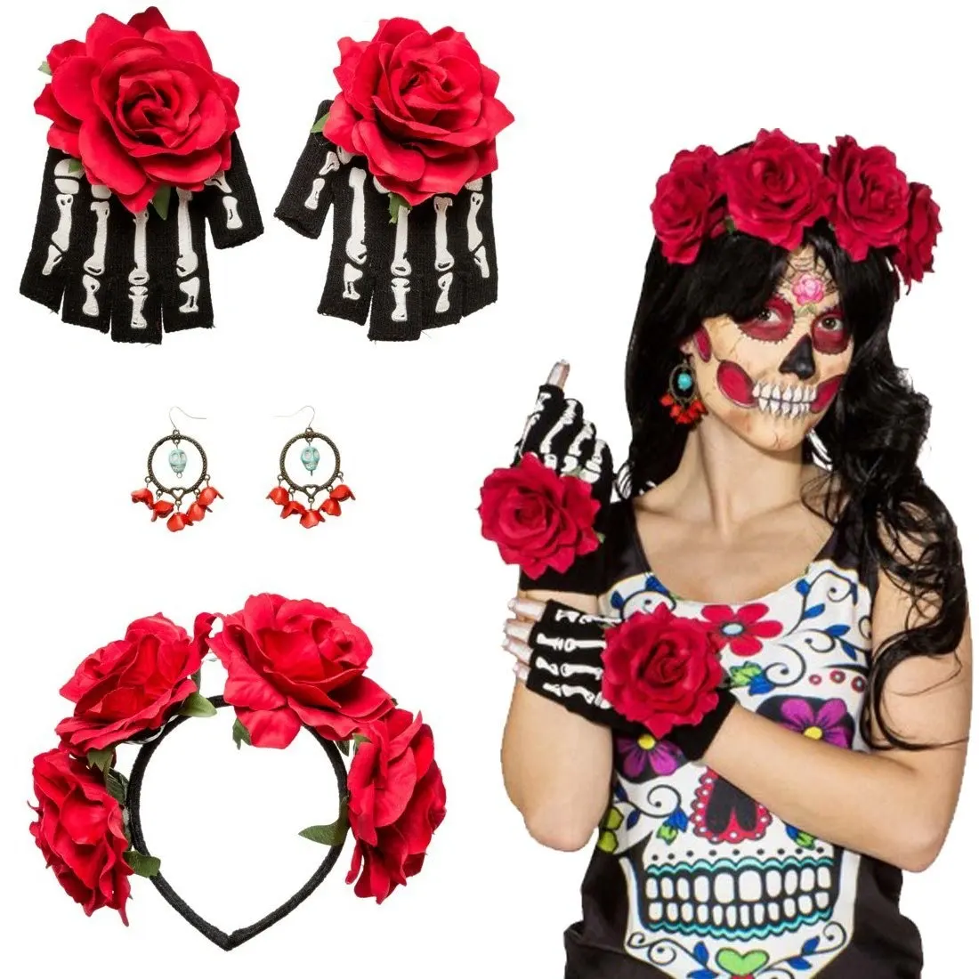 A Day of the Dead-inspired set featuring a red rose alice band, black skeleton gloves with red rose accents, and round long earrings with blue stones and red roses.
