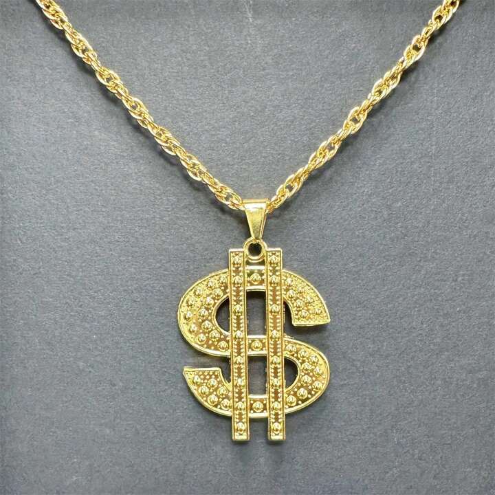A BALD gold dollar sign necklace with a sleek gold chain, featuring a minimalist design without diamonds. Inspired by 80s fashion, it’s perfect for adding a flashy, statement-making touch to any outfit.