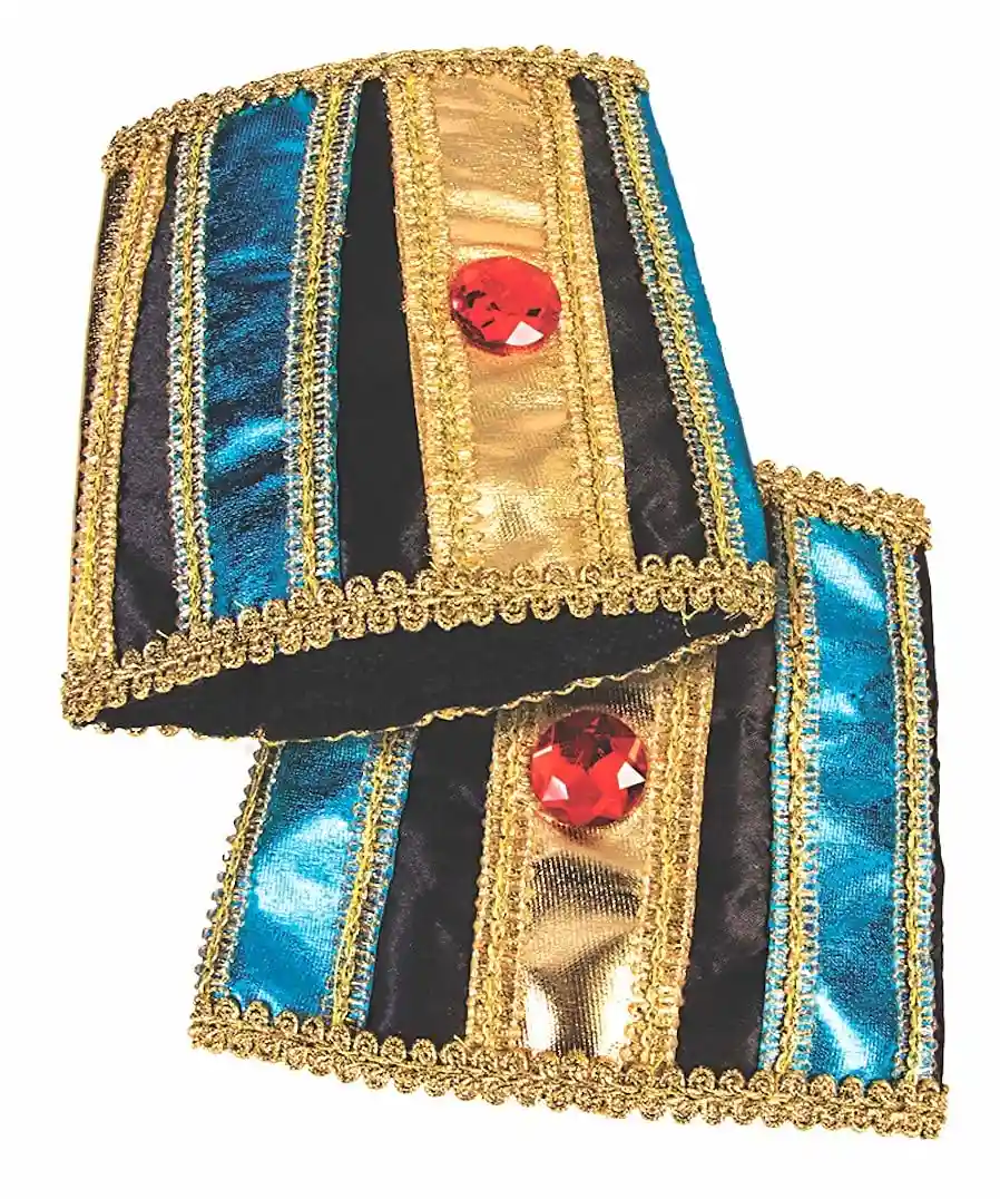 Blue and gold Egyptian wristbands featuring a vibrant red gem in the center. Perfect for adding a touch of ancient elegance to costumes for themed events.