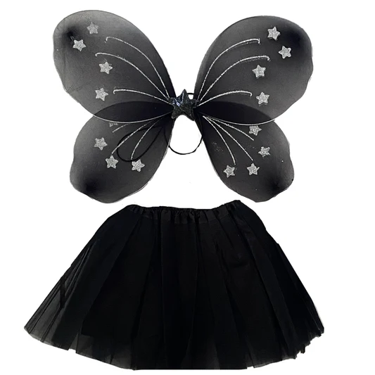 A Black Fairy Set including a tutu skirt and Wing, designed for a mythical and enchanting look. The set features a layered tutu skirt made of tulle and lace, creating a whimsical, gothic-inspired style. The matching black Wing complements the outfit, adding a touch of fantasy. Perfect for costume parties, cosplay, for any fairy-themed event.