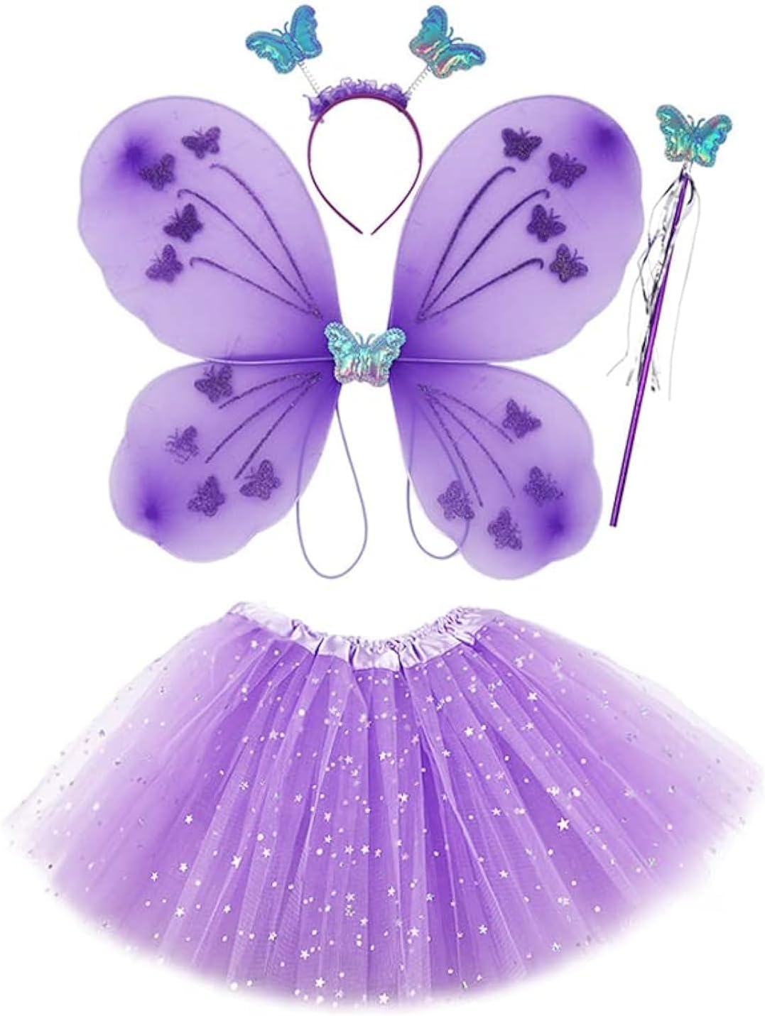 The Purple Fairy Set includes a stunning tutu skirt, delicate wings, a matching wand, and a cute headband, all in a rich purple hue. This magical set is perfect for little ones to dress up as fairies for themed parties, dress-up fun, for imaginative play. The vibrant purple color adds a touch of enchantment and charm to any fairy tale-inspired look!