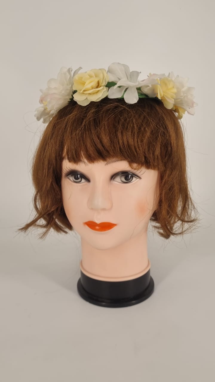 A flower garland for the head featuring soft, elegant cream flowers, ideal for creating a delicate and romantic look. This accessory is perfect for weddings, festivals, or adding a light, ethereal touch to any outfit or occasion.