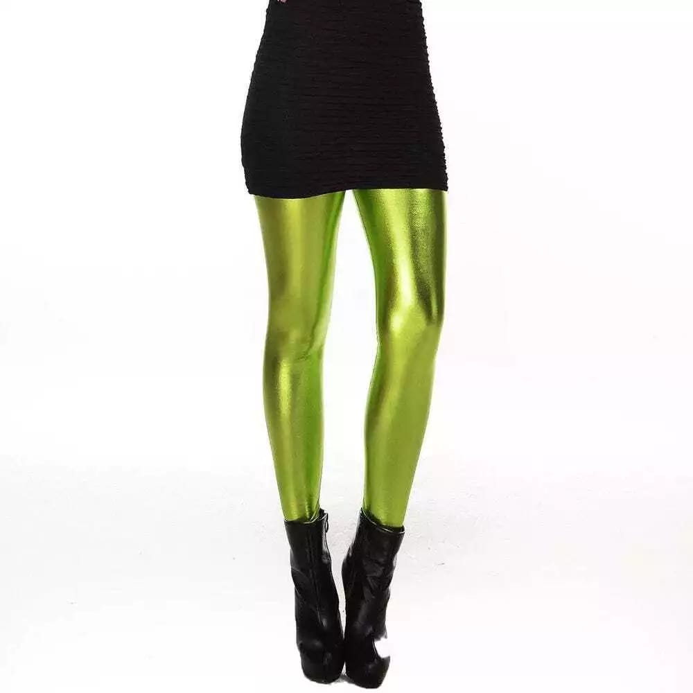 These vibrant green foil leggings feature a shiny, reflective surface that adds a bold, eye-catching touch to any outfit. Made from a stretchy, form-fitting material, they offer comfort and flexibility while hugging your curves. Perfect for a night out, workout sessions, for a fun, stylish look, these leggings can easily be paired with casual for dressy tops. The metallic finish gives them a unique, futuristic appeal, making them a standout piece in your wardrobe.