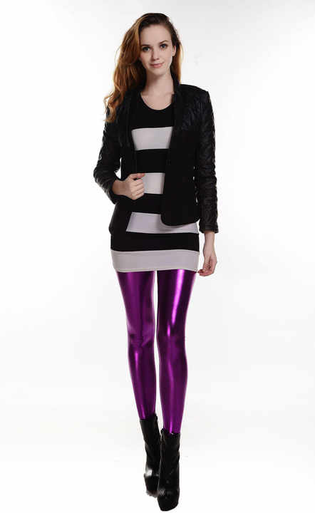 These vibrant purple foil leggings feature a shiny, reflective surface that adds a bold, eye-catching touch to any outfit. Made from a stretchy, form-fitting material, they offer comfort and flexibility while hugging your curves. Perfect for a night out, workout sessions, for a fun, stylish look, these leggings can easily be paired with casual for dressy tops. The metallic finish gives them a unique, futuristic appeal, making them a standout piece in your wardrobe.