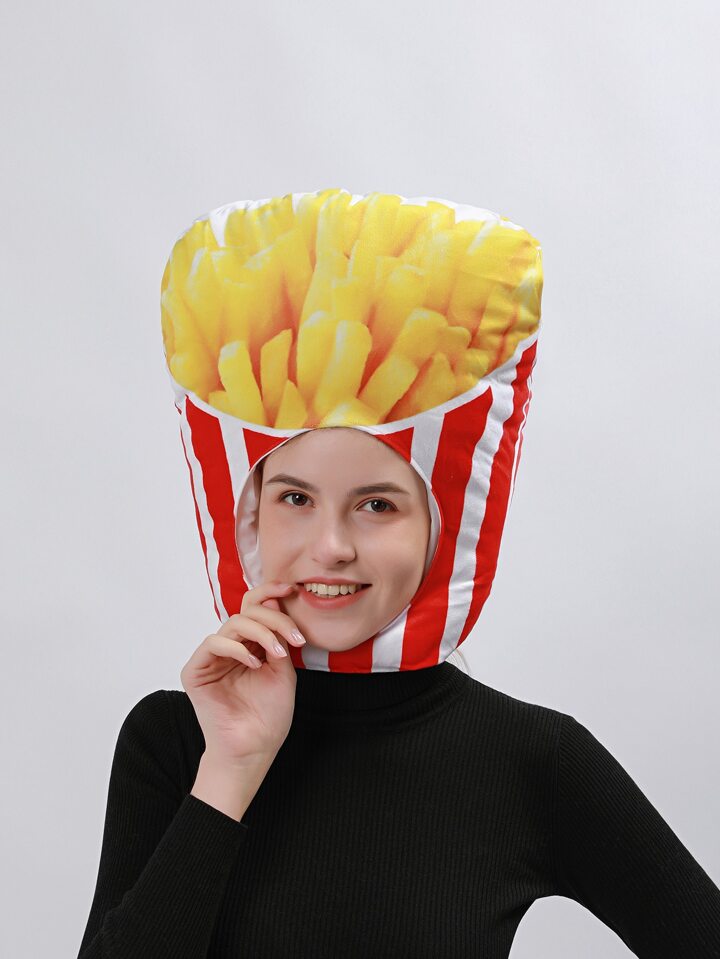 A French Fries Headpiece Costume is a fun and flavorful accessory that transforms your head into a supersized serving of everyone’s favorite snack! Perfect for food-themed parties, Halloween, or group costumes, this playful headpiece typically features: