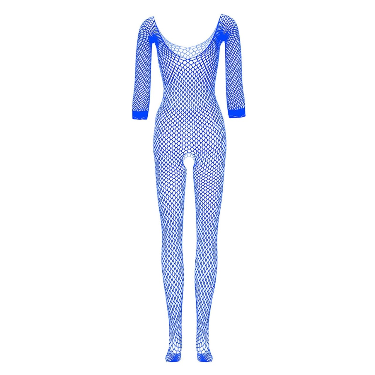 Vibrant blue full-body fishnet stockings, offering a comfortable, breathable fit with a bold and edgy design. Perfect for costumes for adding a playful touch to any outfit.