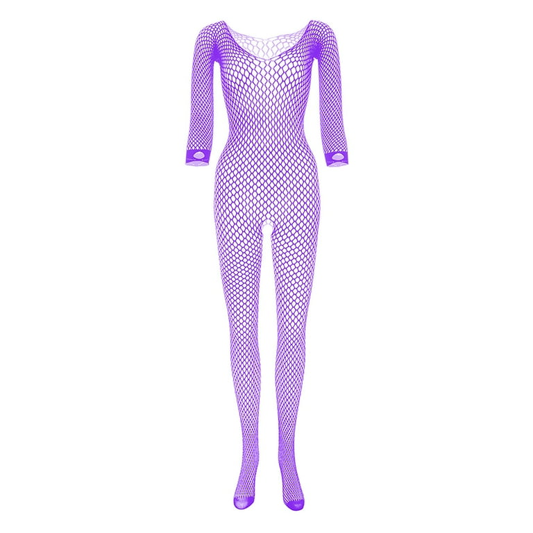 Vibrant purple full-body fishnet stockings, offering a comfortable, breathable fit with a bold and edgy design. Perfect for costumes for adding a playful touch to any outfit.