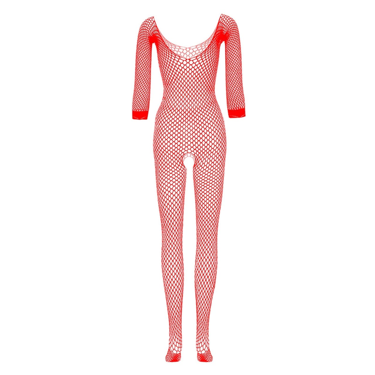 Vibrant red full-body fishnet stockings, offering a comfortable, breathable fit with a bold and edgy design. Perfect for costumes for adding a playful touch to any outfit.