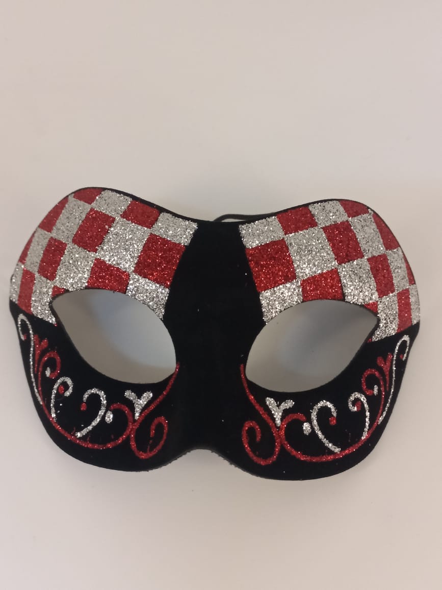 A glitter black and mixed silver and red mask is a dazzling accessory, combining a shimmering black base with vibrant silver and red accents. The glitter adds a sparkling touch, making this mask perfect for masquerades, costume parties, or any event where you want to stand out with a bold, dramatic look.