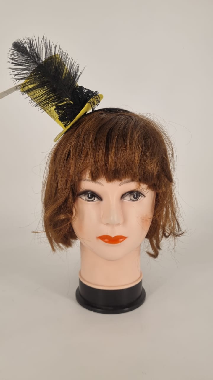 A mini glitter top hat on an Alice band, featuring a radiant gold glitter finish and an elegant black feather accent. This sophisticated accessory adds a touch of luxury and sparkle, perfect for special occasions, themed parties, or making a bold statement with any costume.