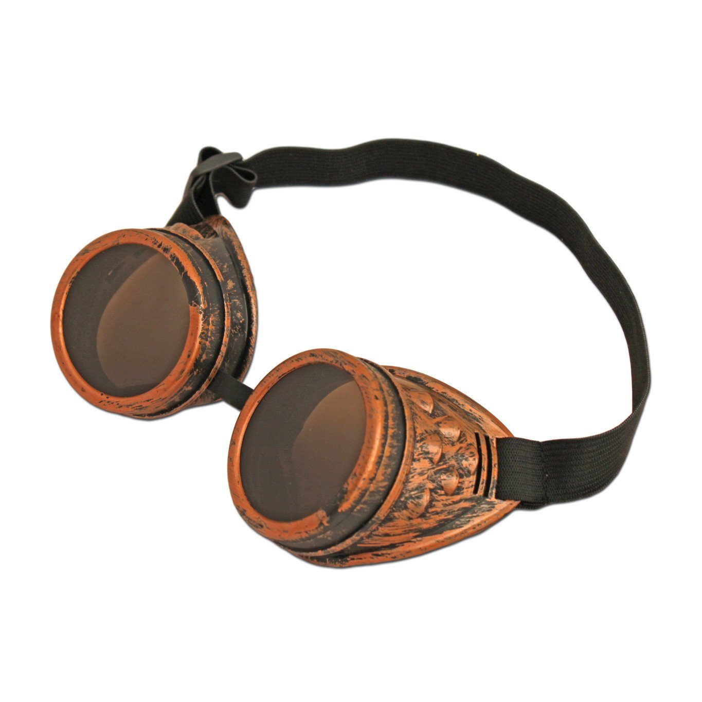Bronze steampunk goggles would have a rich, metallic bronze frame with round or oval lenses, giving them an antique, industrial aesthetic. They would feature vintage-inspired details like gears, rivets, and metal straps. Some designs may include side vents, leather elements, or interchangeable lenses. The bronze color adds a warm, aged look, making these goggles perfect for a steampunk outfit, offering a unique, rugged, and timeless appearance that combines Victorian-era charm with futuristic elements.