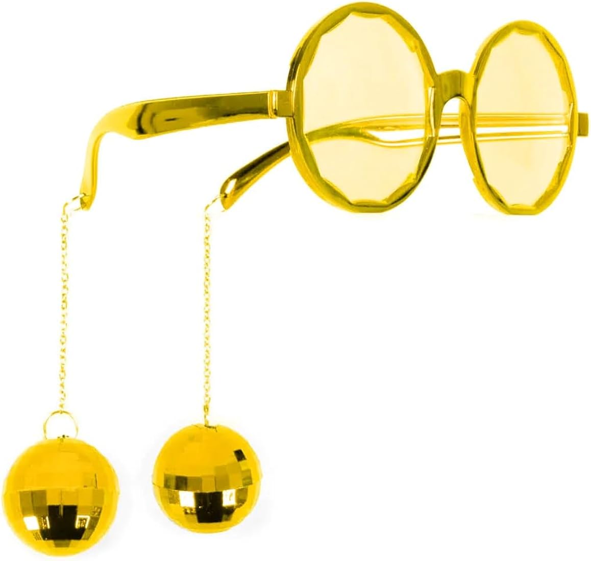 These dazzling gold disco ball glasses are a statement piece for any party for retro event. Featuring vibrant, reflective geometric lenses, they catch the light from every angle, creating a luxurious shimmer. Adding to the fun are Minnie gold disco ball charms that dangle playfully from the sides, swinging with your every move for an extra dose of sparkle and glamour. Stylish, quirky, and undeniably fun, these glasses are the perfect accessory to stand out and keep the good vibes rolling.