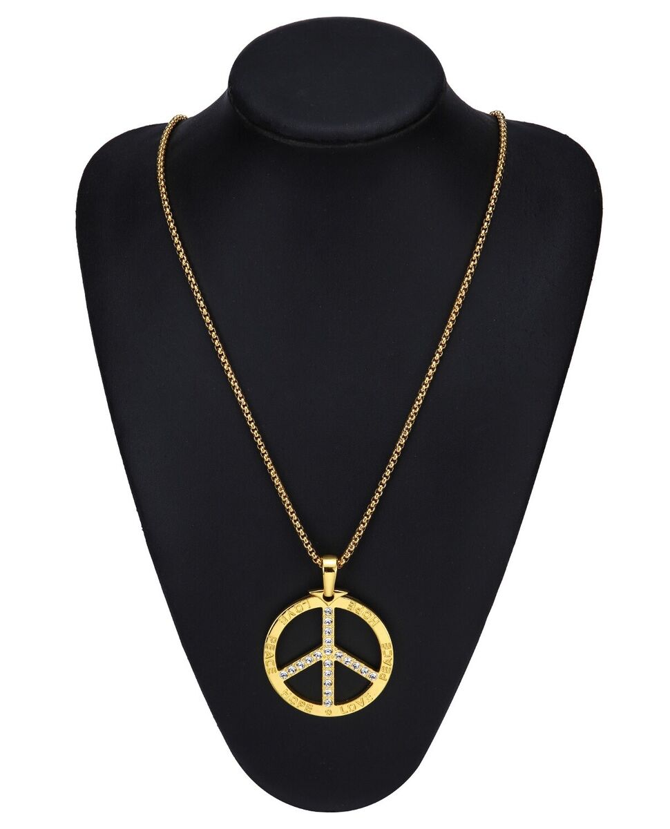 A gold metal peace necklace features a pendant in the shape of the peace symbol, crafted from gold-toned metal. This necklace is often worn to convey a message of harmony, love, and unity. With it’s timeless design and simple elegance, it serves as both a stylish accessory and a reminder of peace and positivity.