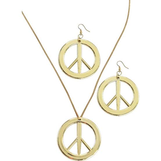 A stylish gold peace sign necklace and earring set featuring a delicate chain with a polished peace sign pendant and matching peace sign stud for hoop earrings. Perfect for adding a touch of boho-chic flair to any outfit.