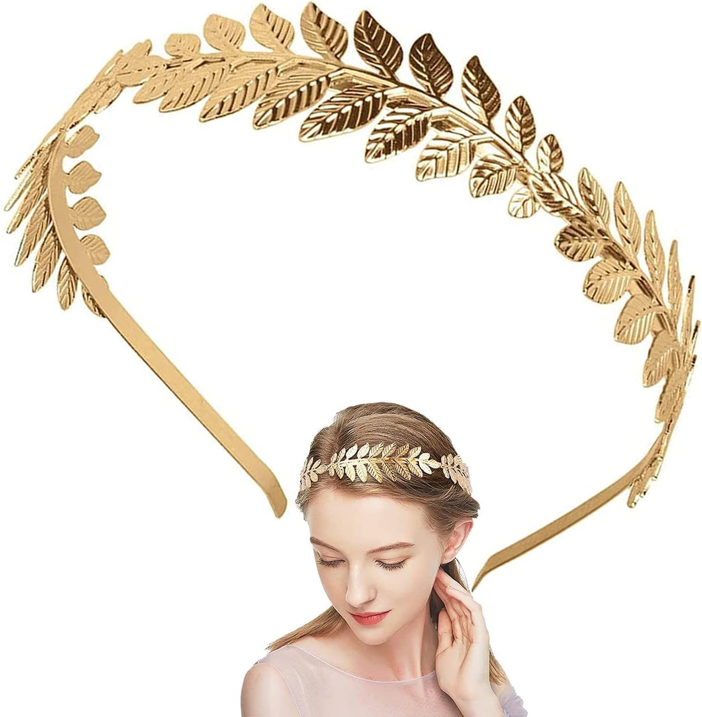 A gold metal wreath crown inspired by ancient Greek design, featuring laurel for olive branches symbolizing victory and peace, offering a timeless, regal look. Perfect for themed events for as a statement accessory.
