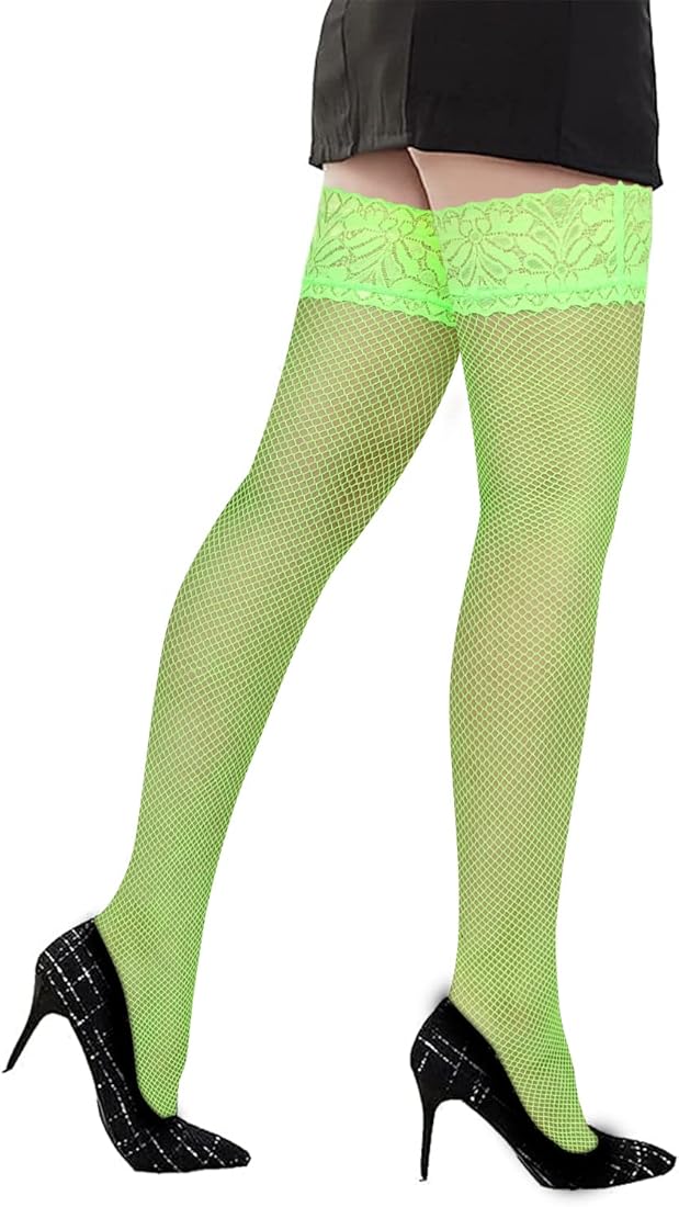 These green LACE fishnet knee-highs combine a classic fishnet pattern with a delicate lace trim at the top for an elegant, yet edgy look. The fishnet design offers a breathable, stretchy fit that molds comfortably to your legs, while the lace adds a touch of femininity and sophistication. Perfect for pairing with skirts, dresses, for costumes, these knee-highs bring a fun pop of color and texture to any outfit. Whether you’re going for a bold, fashionable statement for adding a playful touch to a night out, these green LACE fishnet knee highs are sure to stand out.