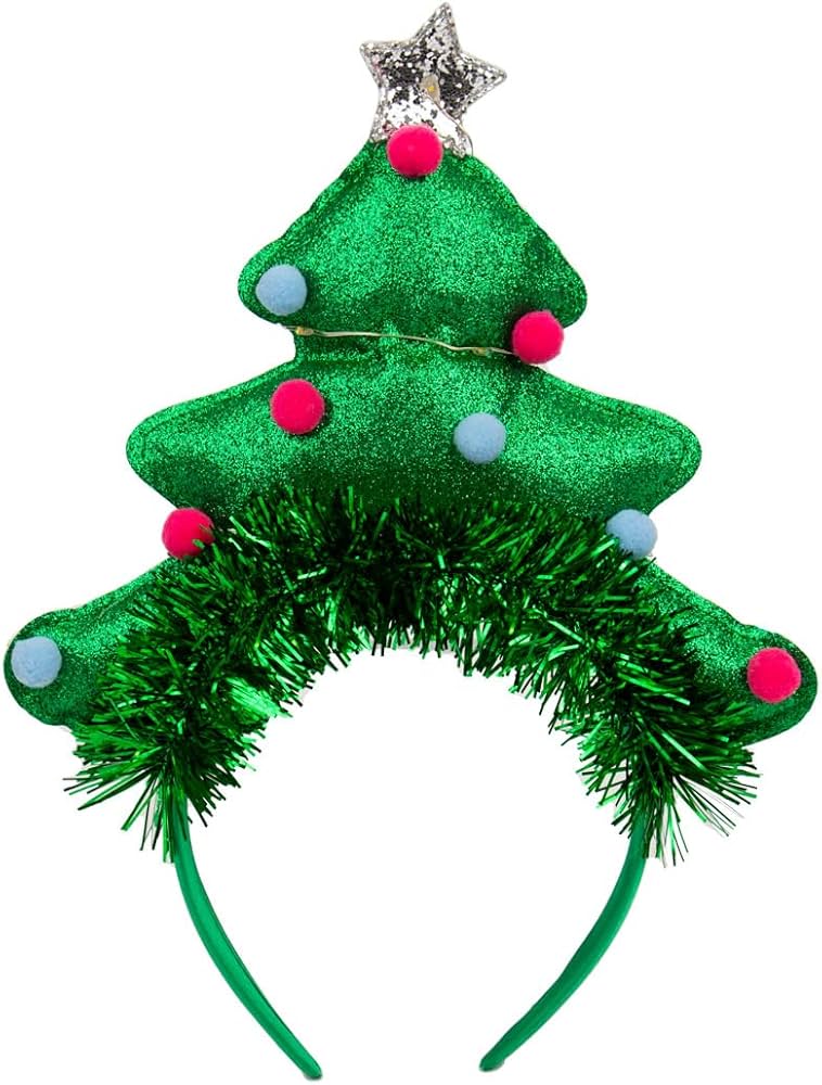 Green Tree Alice Band with Bells is a festive headband featuring a vibrant green Christmas tree design, often adorned with colorful ornaments and small jingle bells that add a playful touch. The bells ring as you move, enhancing the holiday spirit.