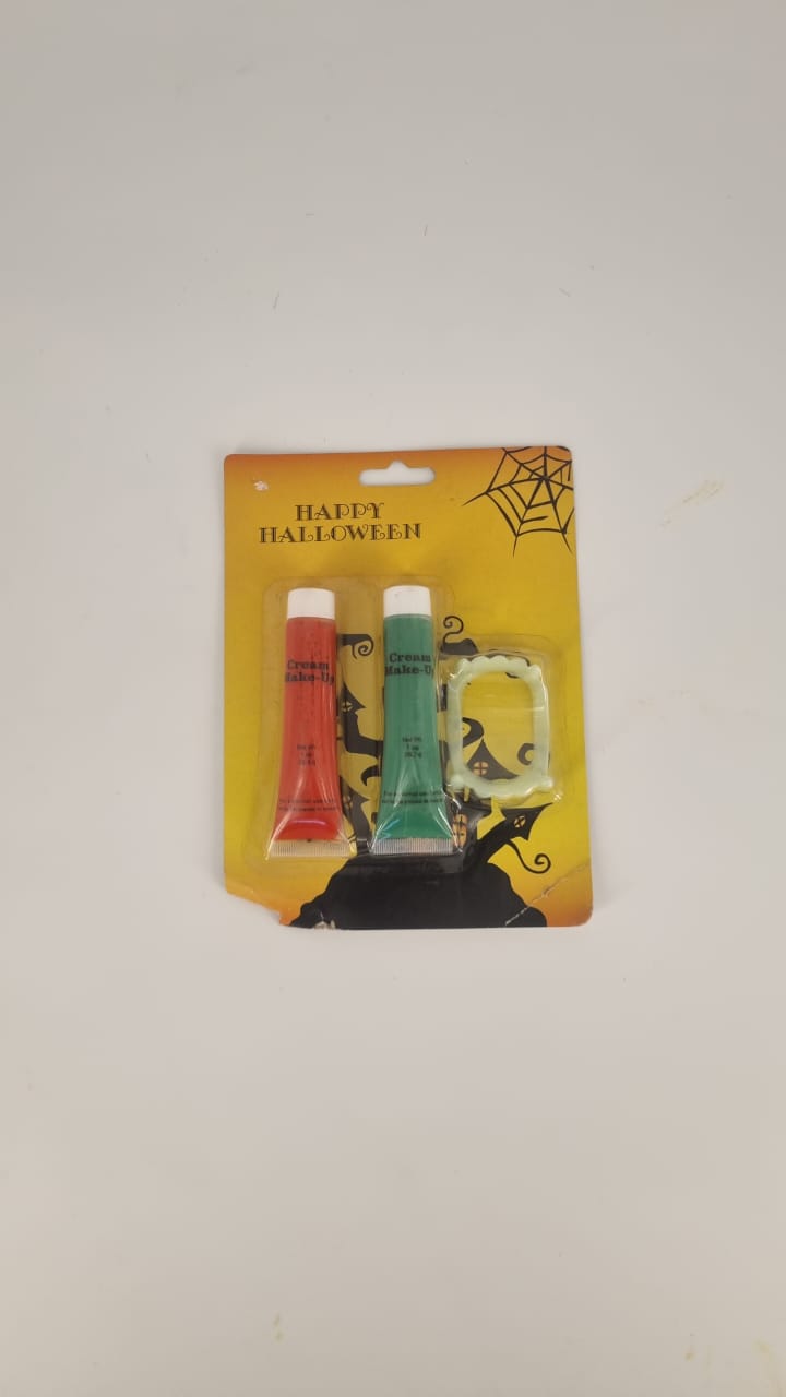 Complete face paint kit featuring 1 tube of green paint, 1 tube of red paint, and a set of glow-in-the-dark vampire teeth. Perfect for Halloween, costume parties, or creative face art. Easy to apply and remove, this kit lets you bring your spooky or fun look to life with a glowing twist!”