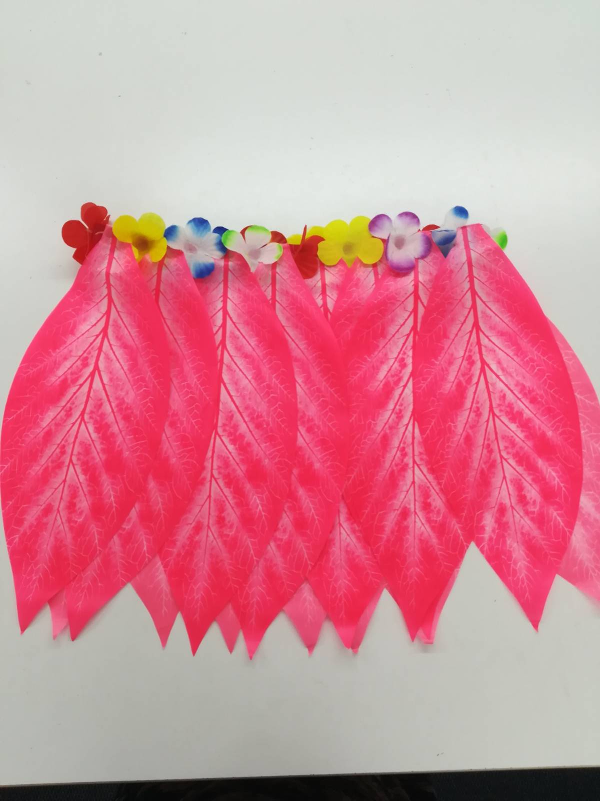Vibrant pink Hawaiian leafy skirt with layered synthetic leaves and an adjustable waistband. Perfect for luau parties, costumes, and tropical-themed events.
