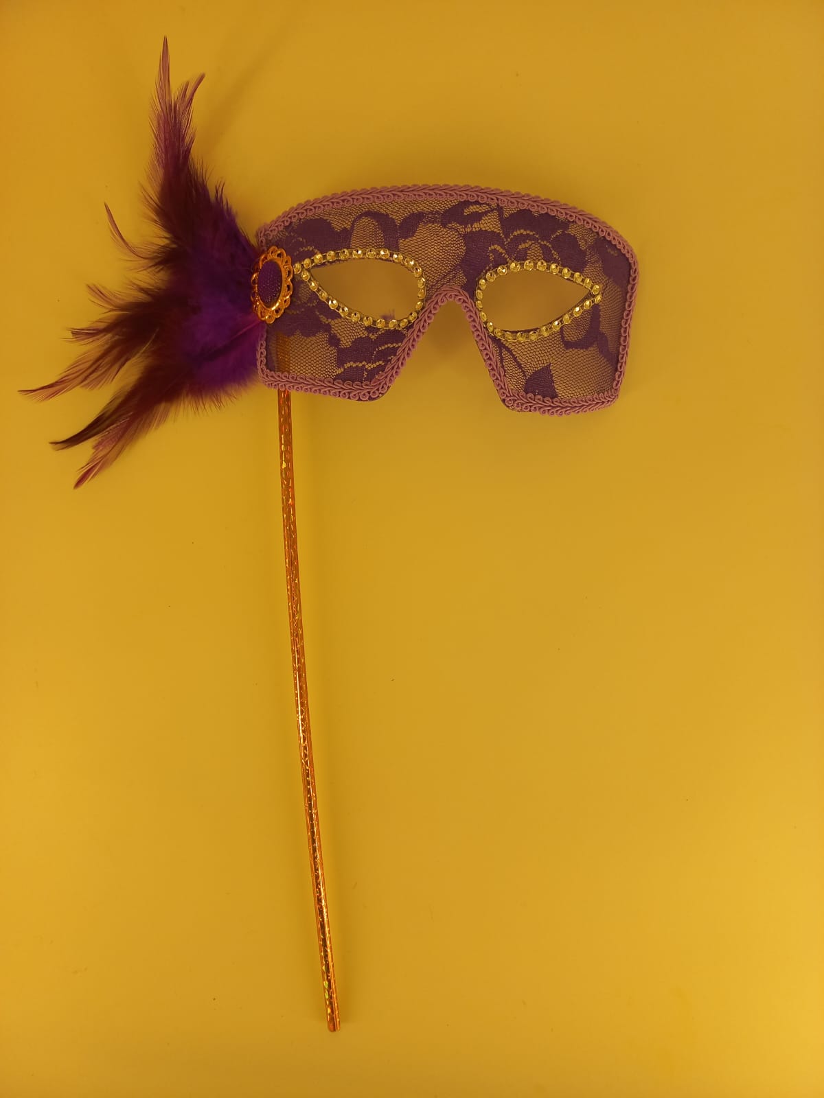 A stunning lace purple mask with a matching stick and elegant feathers, offering a dramatic and sophisticated look. The intricate lace design and bold feathers make it a perfect accessory for a glamorous masquerade or costume event.