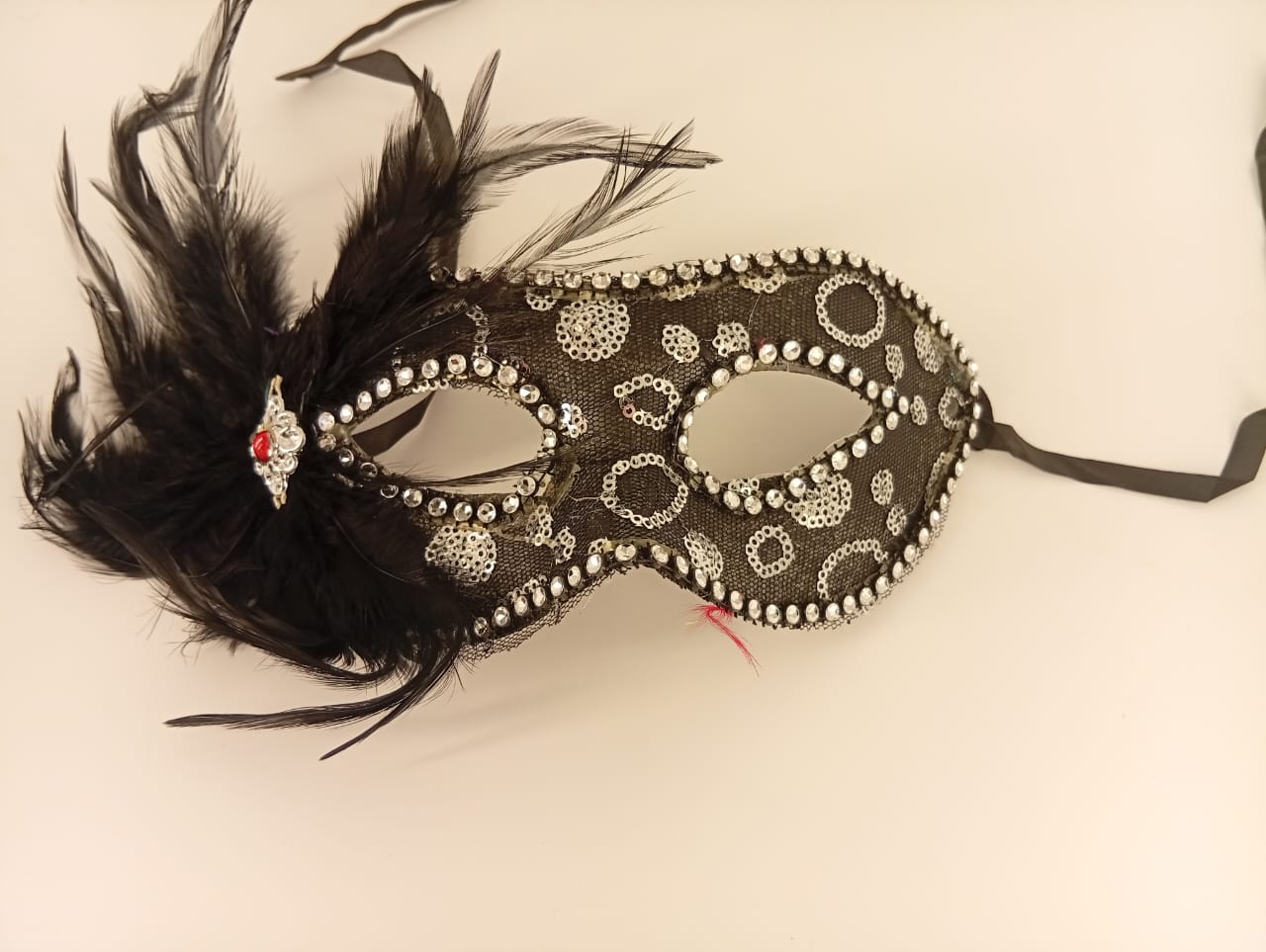🎭 Black Lacey Spotted Sequin Masquerade Mask with Feather Flower – Elegant & Mysterious ✨