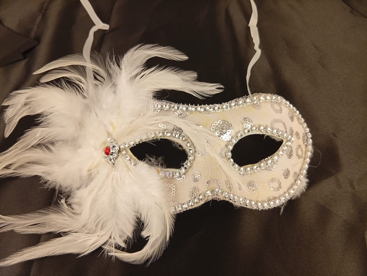 Step into a world of grace and beauty with this white lacey spotted sequin masquerade mask with feather flower—because every event deserves a mask that captivates and mesmerizes! 🎭✨