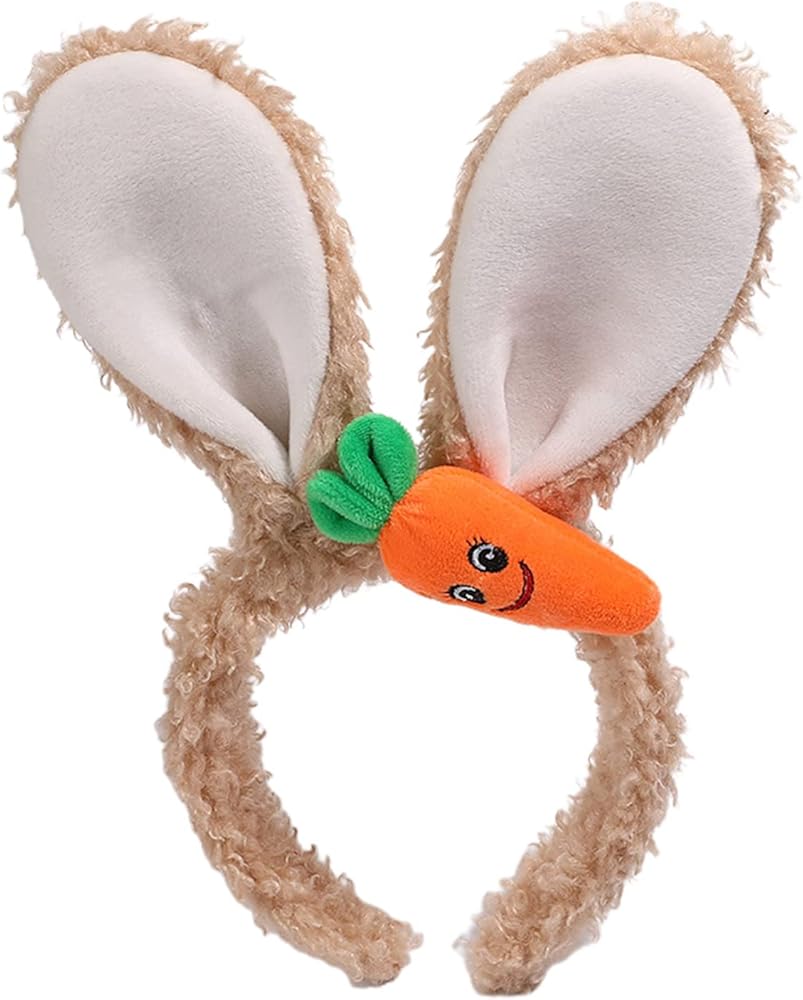 Light brown furry bunny ears with a cute carrot accessory, offering a soft and playful look, perfect for costumes for festive occasions.