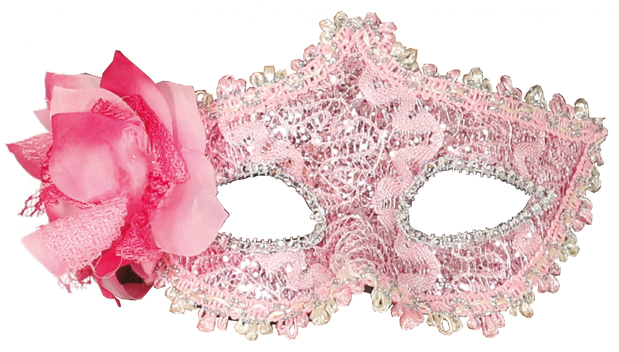 A delicate light pink mask adorned with intricate lace and soft flower details, exuding a romantic and feminine charm for a graceful, elegant look