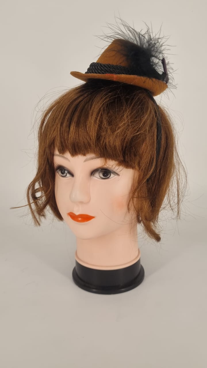 A mini German-style hat on an Alice band in brown, complete with traditional accents like a feather, ribbon, or decorative details. This charming accessory adds a rustic and authentic touch to your look, perfect for Oktoberfest, themed events, or as a fun, unique addition to your costume.