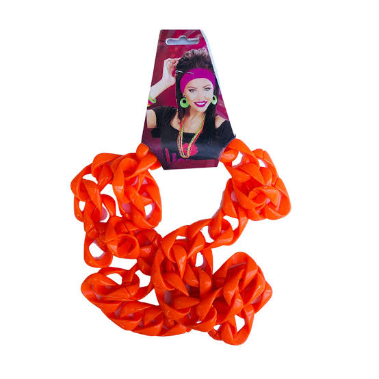A BALD neon orange chain necklace inspired by the 1980s, featuring oversized, lightweight plastic links with a glossy finish. Perfect for adding a retro pop of color to your outfit or completing an 80s-themed look.